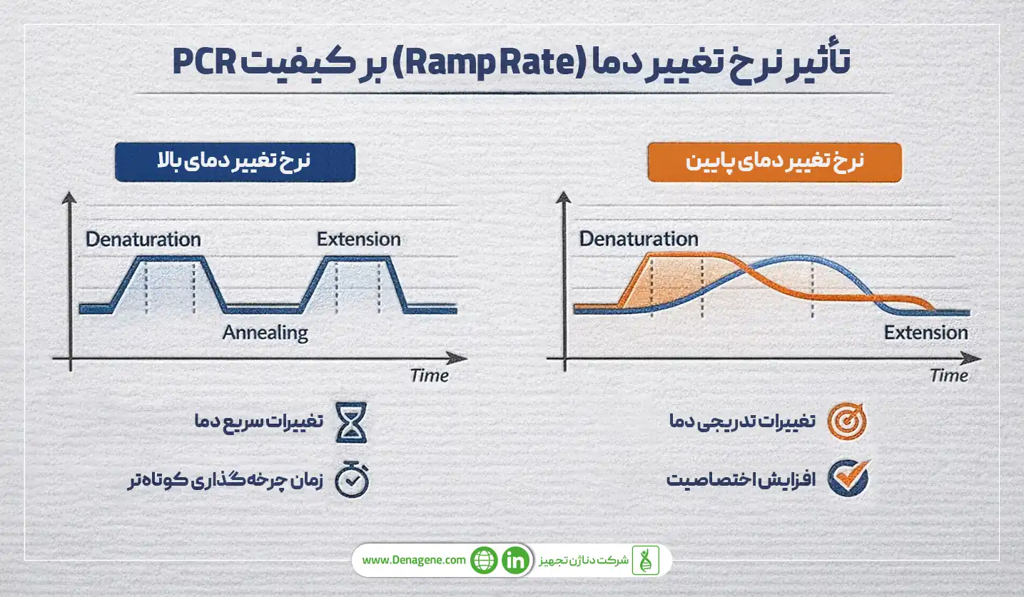 در PCR، دستگاه دما را بین مراحل تغییر میدهد و سرعت تغییر دما یا Ramp Rate را مشخص میکند که چقدر سریع نمونه به دمای مناسب هر مرحله برسد.